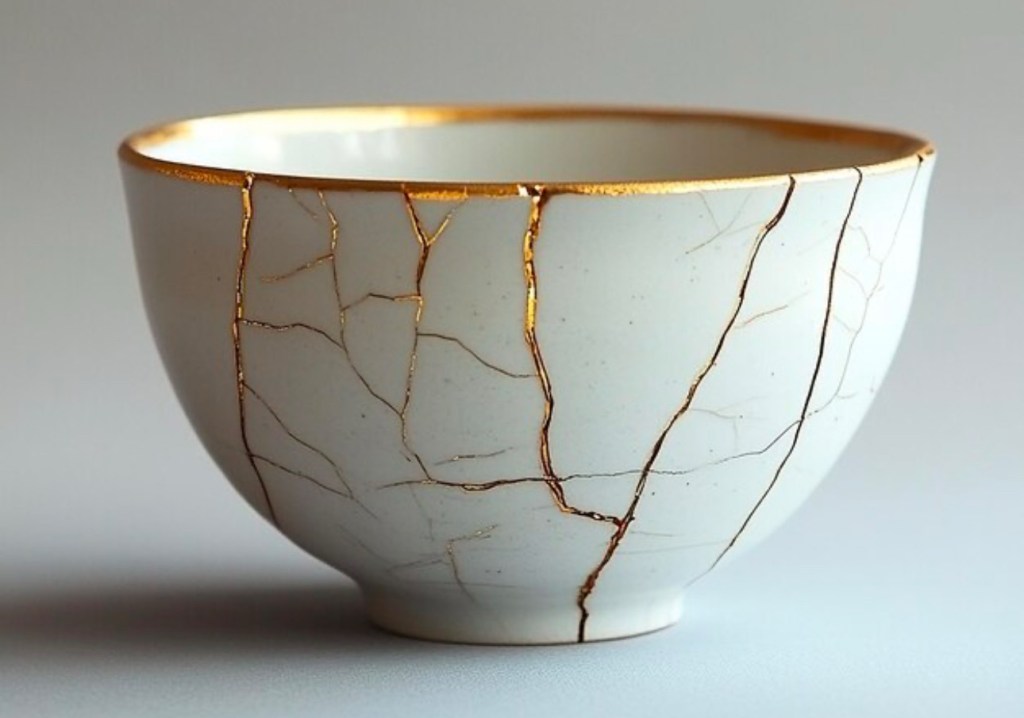 Kintsugi is proof that some things are even more beautiful for having been broken. In life, love and relationships, often it’s the challenges that make us stronger and allow us to rebuild. This idea starts to sink in as I’m glueing my four broken pieces back together and filling in any gaps with putty.